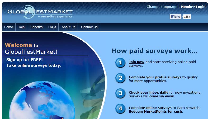 I have Been a Part of GlobalTestMarket since Past Few Years and I would really Say it is one of the Best Survey Sites with Regular Surveys Daily Almost.For Each Completed Survey You will Receive the Points Depending Upon the Survey Credited to your Account Instantly which you can Redeem them for Cash once you reach the Minimum Payout Threshold. The Best Part of GlobalTestMarket is that they are Spread Across 200 Different Countries with an Approximate of 5.5 Plus Million Users Registered to GlobalTestMarket.You will Receive Survey on Your Mails and Once you complete them Points will be Credited to your Account.You can Withdraw your Payment Using Check Which Usually takes about 8 weeks to Reach to you depending upon your Location.Refer to Your Friends and Family and Earn Incentives.